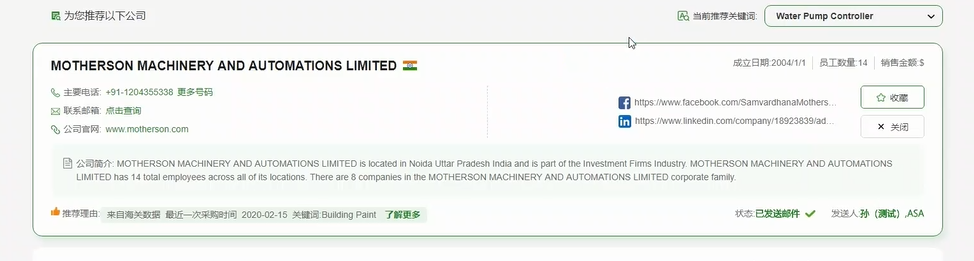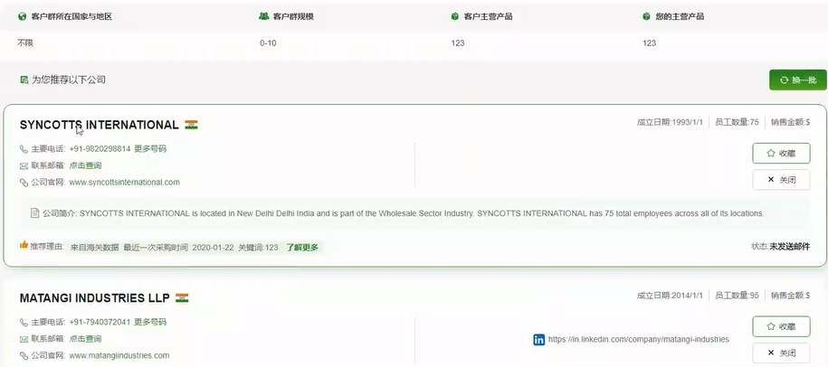 3、精準推薦:精準推薦信息最全,匹配度最高的單個(gè)公司詳情數據,直接展示落地頁(yè)??芍苯硬榭垂拘畔?,聯(lián)系人信息以及采購行為數據, 也可在當前頁(yè)直接發(fā)送郵件進(jìn)行聯(lián)系,可點(diǎn)擊換一批更換公司查看。