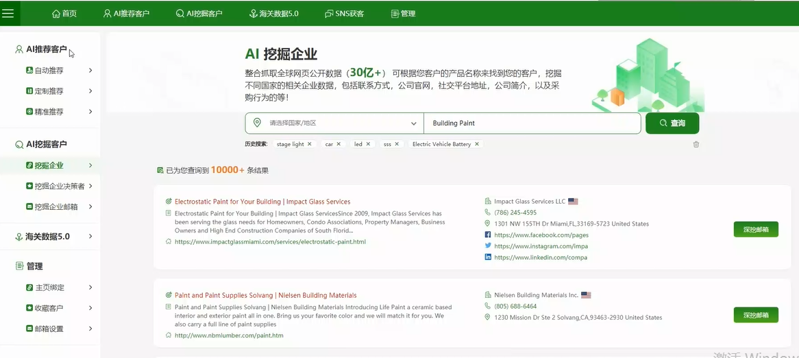 3、操作智能化:自主搜索時(shí),只需輸入產(chǎn)品、聯(lián)系人郵箱、公司社交平臺地址等任意條件都均可搜索到想要目標企業(yè)信息,同樣精準有效。