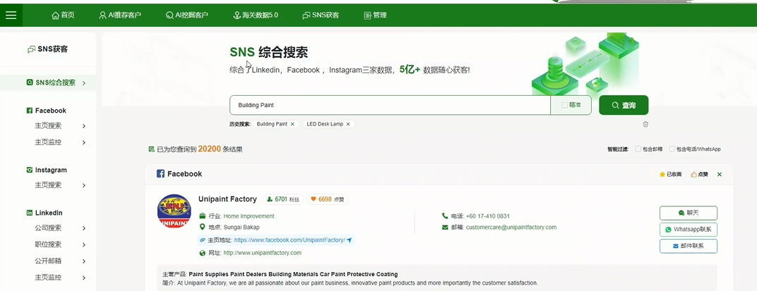 1、綜合了Linkedin,Facebook ,Instagram三家數據,5億+ 數據隨心獲客。支持一鍵WhatsApp聯(lián)系、發(fā)送郵件;支持社交平臺互動(dòng)跳轉(點(diǎn)贊等)