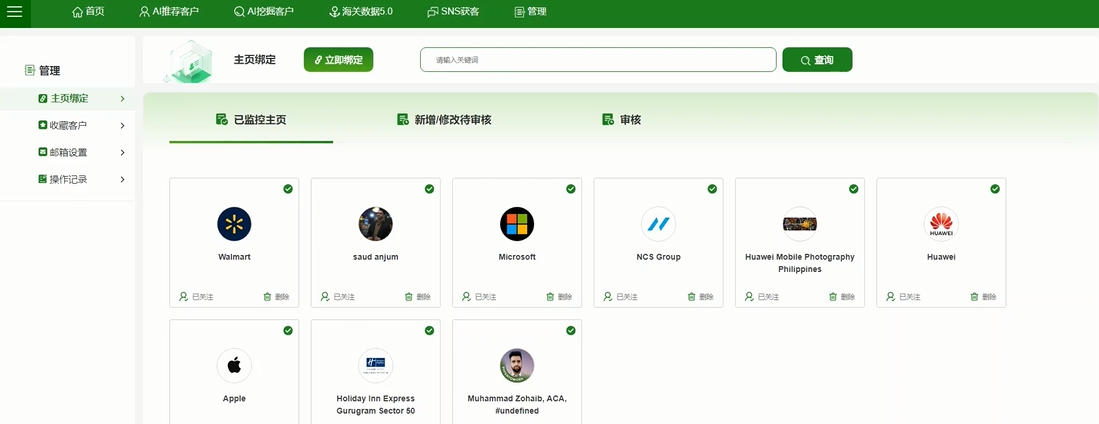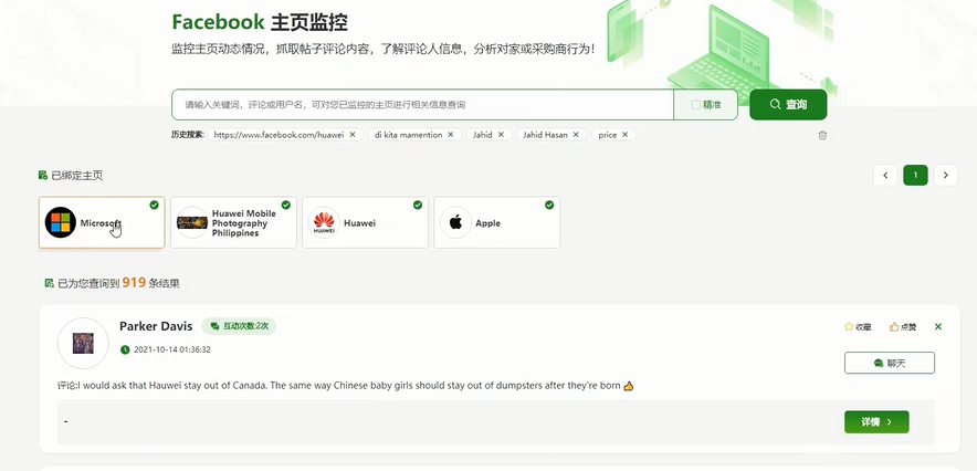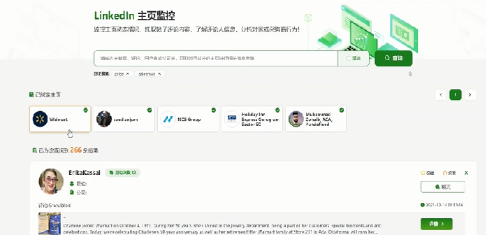 2、主頁(yè)監控:支持綁定Linkedin,Facebook ,Instagram客戶(hù)主頁(yè),實(shí)現主頁(yè)監控;支持監控主頁(yè)內關(guān)鍵詞查詢(xún);支持綜合搜索頁(yè)跳轉,查詢(xún)關(guān)聯(lián)SNS頁(yè)面信息